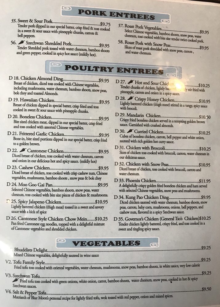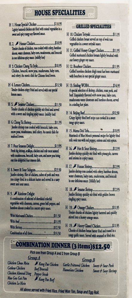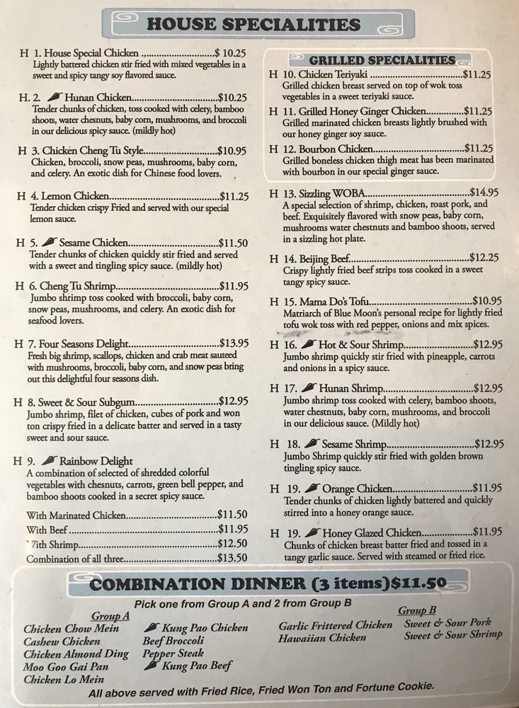 Blue Moon Restaurant, located in Edmond, Oklahoma, is a longstanding favorite for authentic Chinese cuisine. Known for its clean environment, friendly staff, and extensive menu options, this restaurant offers a range of dishes that have impressed customers for years. From delectable egg rolls and savory soups to flavorful entrees, Blue Moon consistently delivers delicious meals that keep patrons coming back for more. With a cozy atmosphere and prompt service, dining here is always a pleasant experience. Whether you're in the mood for a quick lunch, a group gathering, or a family dinner, Blue Moon has something for everyone. With a reputation for excellent food and reasonable prices, this restaurant is a must-visit for lovers of Chinese cuisine.